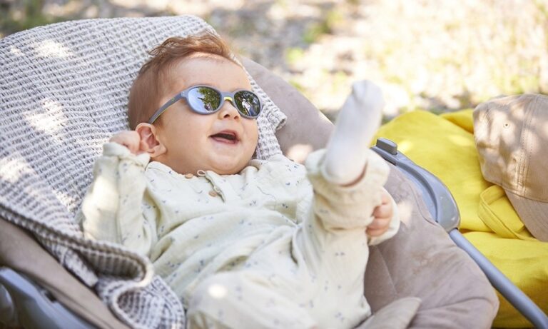 Dès que votre bébé commence à sortir régulièrement à l’extérieur, en poussette, au parc, à la plage, il est recommandé de lui faire porter des lunettes de soleil adaptées.