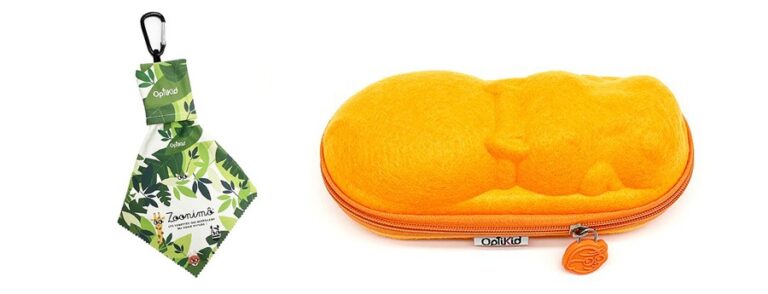 Les lunettes sont accompagnées d’un étui et d’une chiffonnette ludique en forme de cravate, facilement transportable grâce à un petit mousqueton.