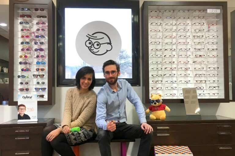 Sophia et Valentin, opticiens diplômés et spécialistes de la vision des enfants vous reçoivent dans leur espace Optikid.